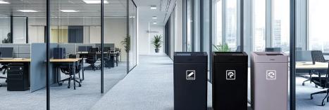 Strategisch platzierte Abfallbehälter für recycelbare und organische Materialien in einer Büroeinrichtung.