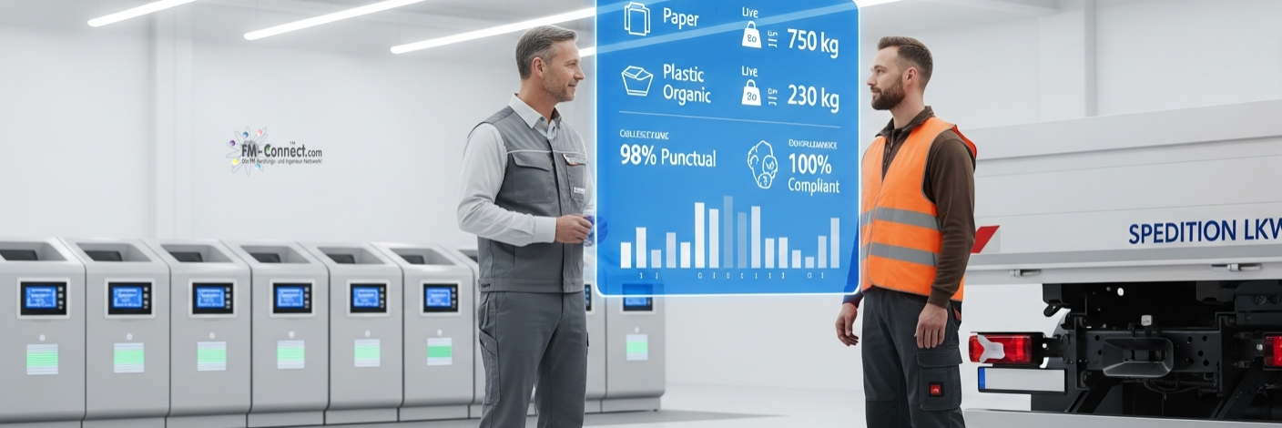 Abhol- und Übergabeprozess: FM koordiniert Zeitfenster und Zufahrtsregelungen; Fachbereiche stellen konforme Verpackung/Kennzeichnung sicher; Abfallbeauftragte prüfen Deklaration; Übergabe wird per Wiegeschein/Begleitschein dokumentiert.
