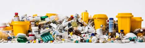 Sammlung medizinischer Abfälle, inklusive Behälter, Medikamente und Verpackungen, für sachgerechte und sichere Entsorgung.